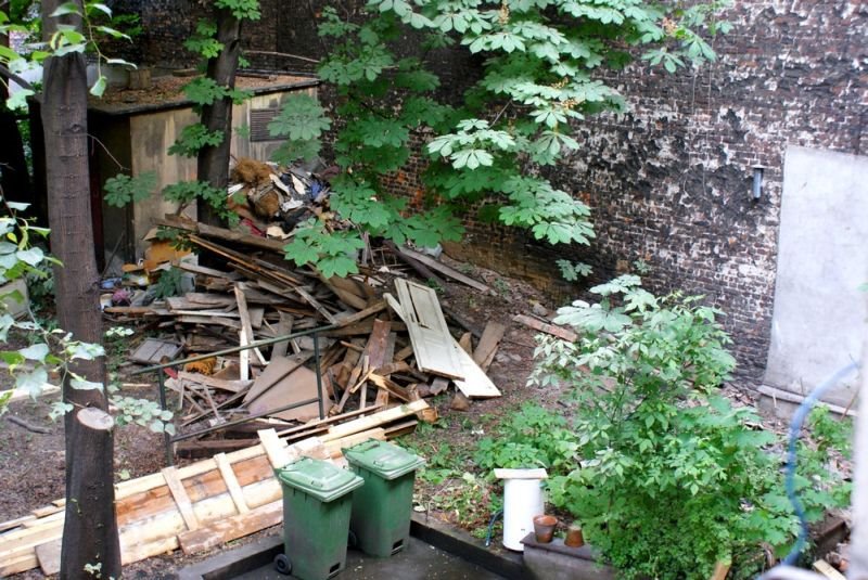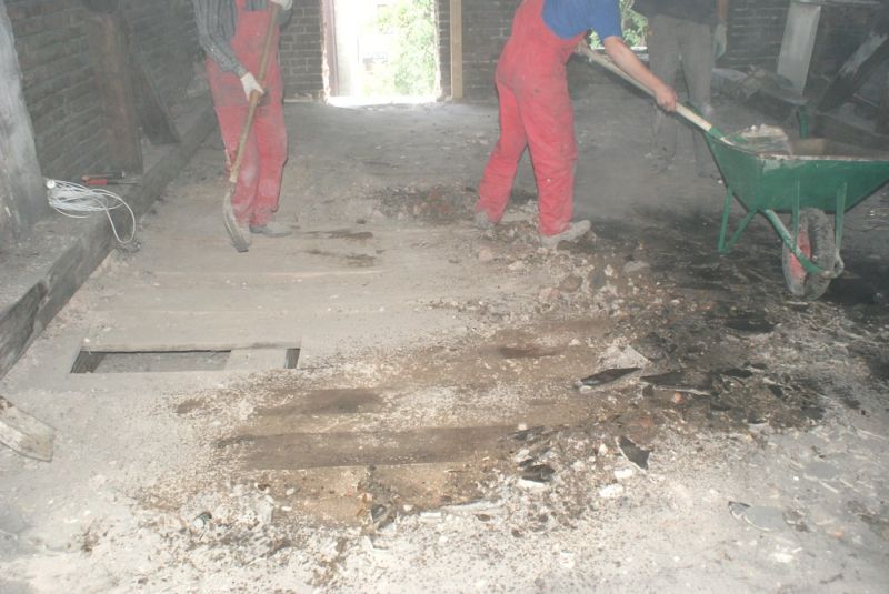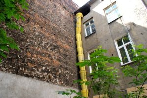 Ta żółta rura od środka jest czarna od polepy. Przez wykuty otwór zrzucane są dechy i śmieci, pył wiruje w powietrzu…