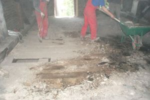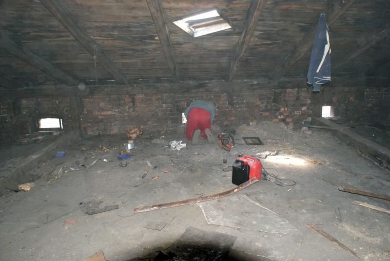 Robotnicy pracują. To mnie dziwi niezmiernie, ale oni naprawdę zwijają się jak mrówki. Często ich obserwuję. Tak wygląda strych od strony wejścia. Nic z niego nie zostanie, wszystko zostanie rozebrane, będzie nowy strop, nowe mury trzeciego piętra, a nad nimi czwarte piętro-poddasze.