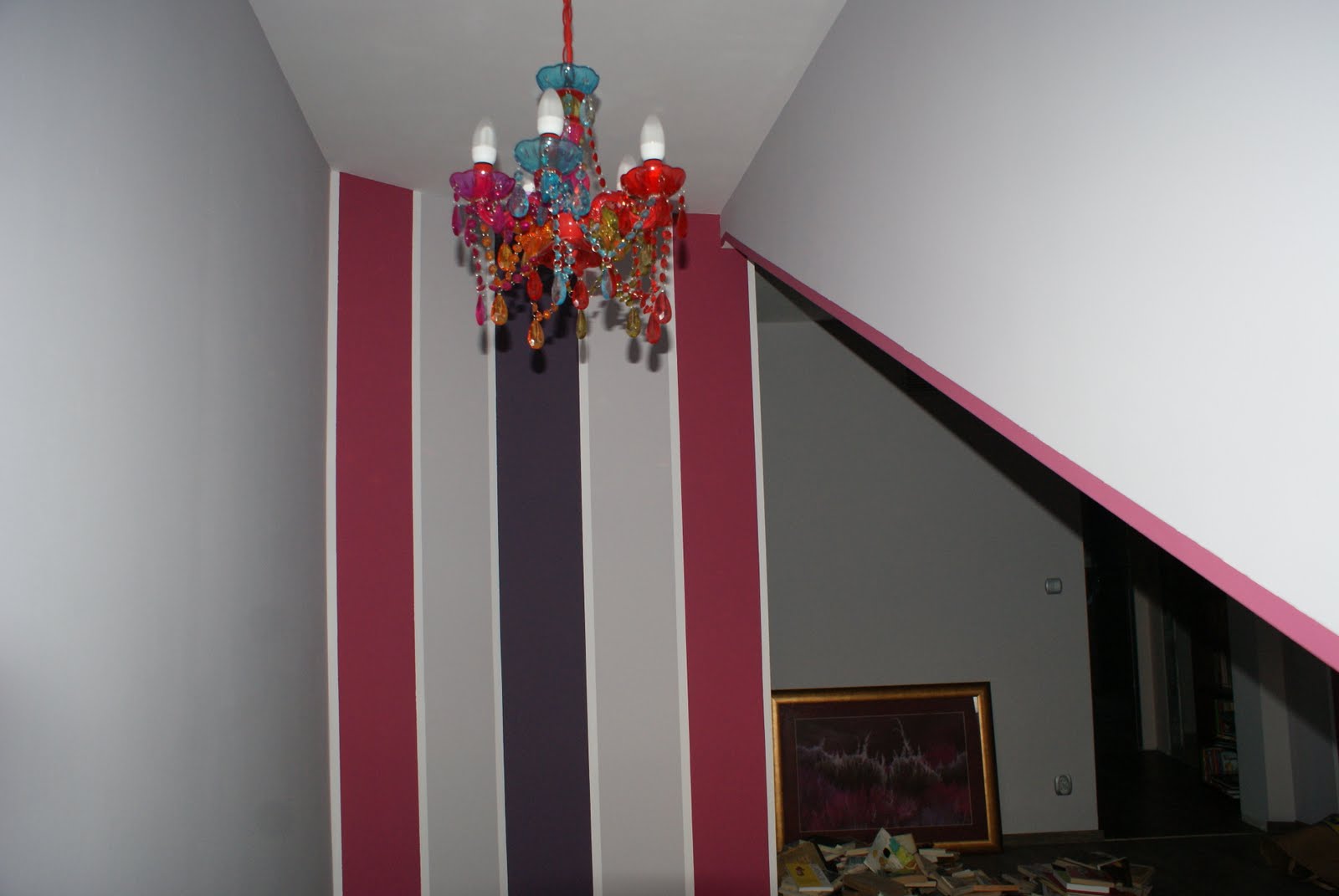 Guśka lubi kolory i dobrze. Pasy na ścianach są ciężko wypracowanym kompromisem pomiędzy ścianą całą w mocnym fiolecie i jeszcze mocniejszym amarancie.