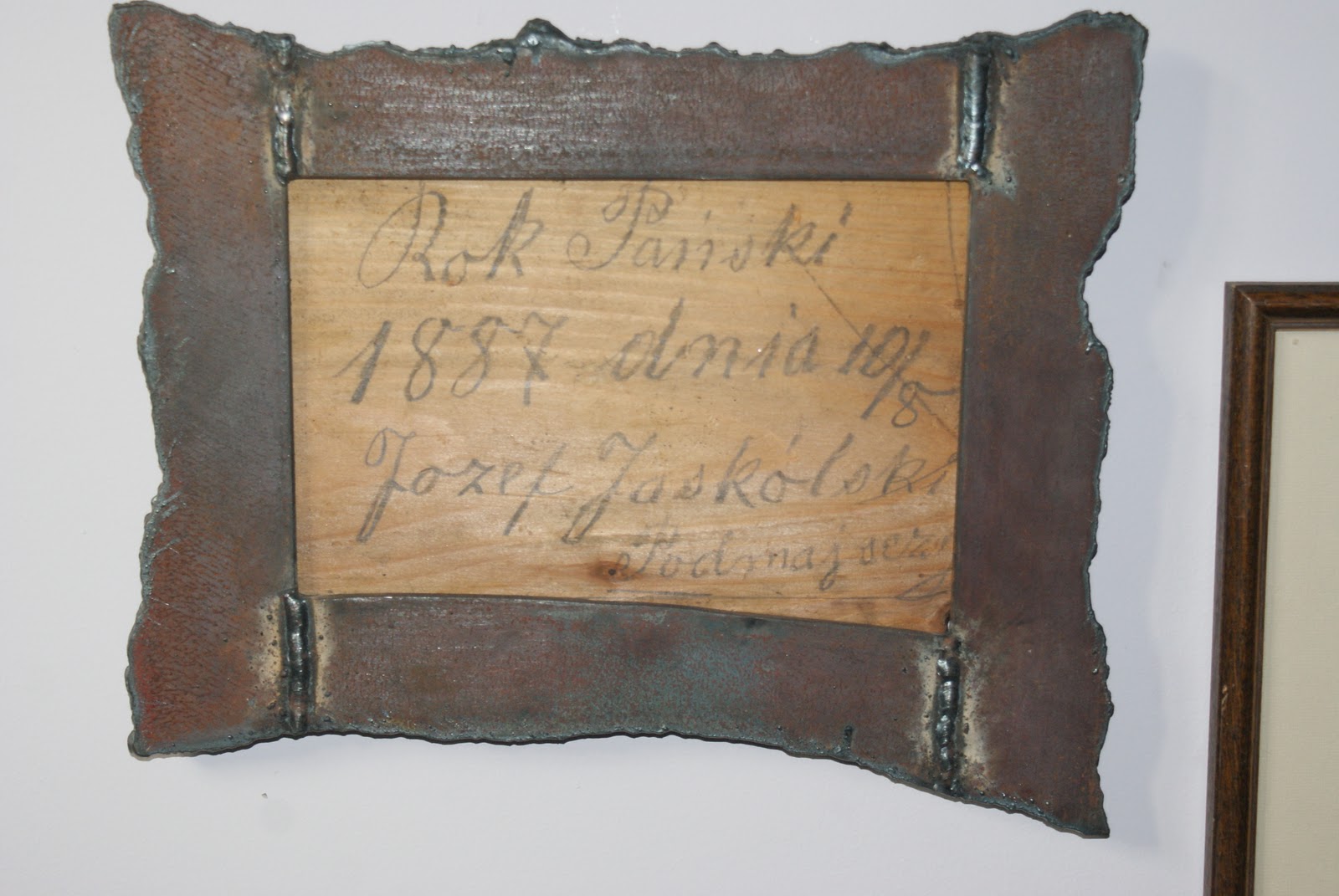 Bronek, wszelki duch Pana Boga chwali!Widzę, że ciągle jesteś poza granicami naszego pięknego kraju?A ramka jest ze surowego metalu, zrobiona przez kowala, ale oczywiście współcześnie. Tabliczka była oheblowana, ale nie oprawiona. Właściwie to nie tabliczka, a kawałek popisanej ołówkiem deseczki.Pokryłam to werniksem, na wszelki wypadek.Ściskam mocno!