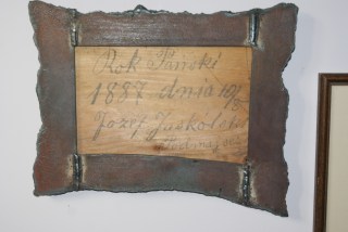 Ciekawa byłam ich budowy, musieliśmy znaleźć sposób na renowację zniszczonych schodów przy jak najmniejszej uciążliwości dla użytkowników. Nie miałam żadnych przeczuć, stopień wybrałam losowo. Znaleziona pod nim mumia szczura, ku mojej uldze rozsypała się w proch, ale tabliczka zostawiona 123 lata temu przez Józefa Jaskólskiego, podmajstra przetrwała i teraz oprawiona wisi wśród moich obrazów stanowiąc świadectwo marności nad marnościami, bo schody zrobione przez Pana Józefa trwają do dziś, a po nim… ech…