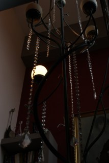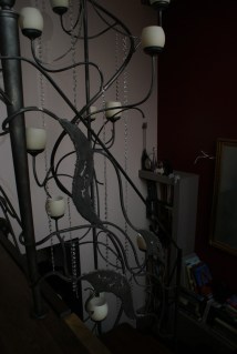 Cudowna lampa nad schodami cierpi na brak żarówek, bo z przewidzianych czternastu sztuk ma zaledwie dwie.