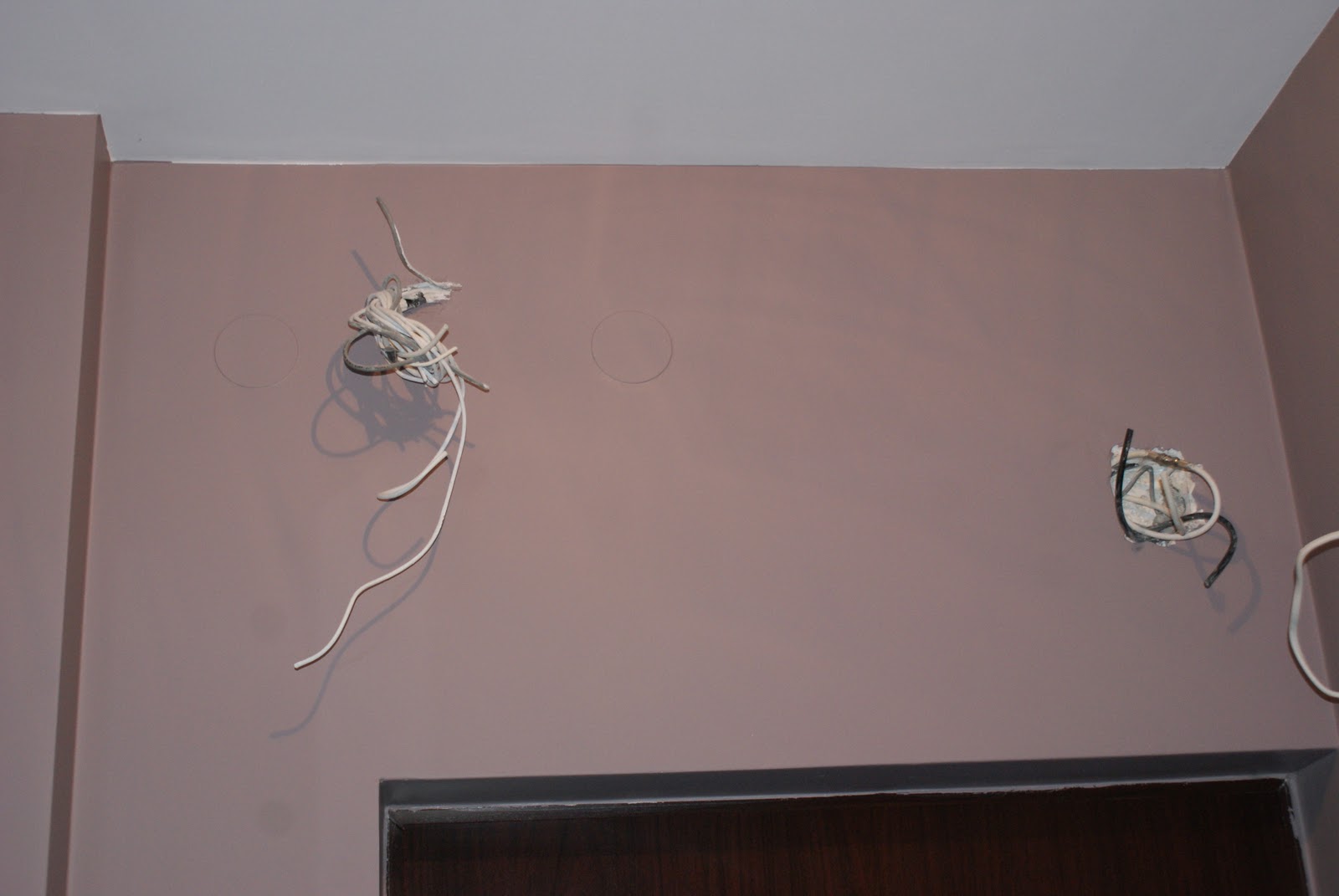 Poniżej: widok z drugiego poziomu na lampę i sterczący kabelek na suficie. Oczywiście, że na etapie budowy było zrobione specjalne wzmocnienie pod lampę, bo już wtedy mialam przeczucie powieszenia tu czegoś ciężkiego. Okazało się jednak, że nie pasuje… akurat ta lampa nie zmieściła się między schodami.