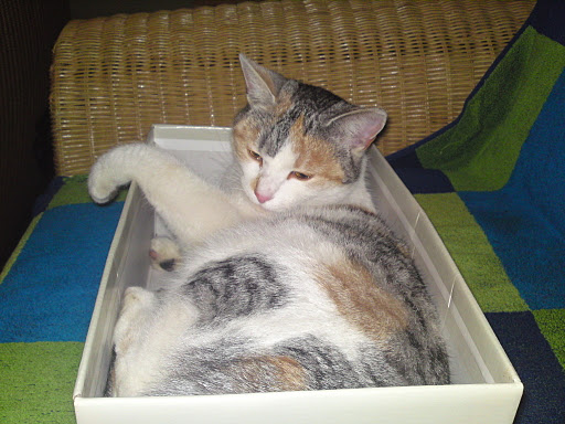 O rany… Mój mąż, zakochany po uszy w naszej kotce, dopatrzył się podobieństwa w pewnej małej niesymetryczności w budowie oczu… (ja tej niesymetryczności w ogóle nie widzę, ani u niego, ani u kotki). A kotka ma to PO NIM :)Przyniósł ją gdy miała dwa miesiące, dostał w prezencie służbowym – do jego szefa przyszła ciężarna kotka i na drugi dzień urodziła czworo dzieci. To było ponad 13 lat temu.