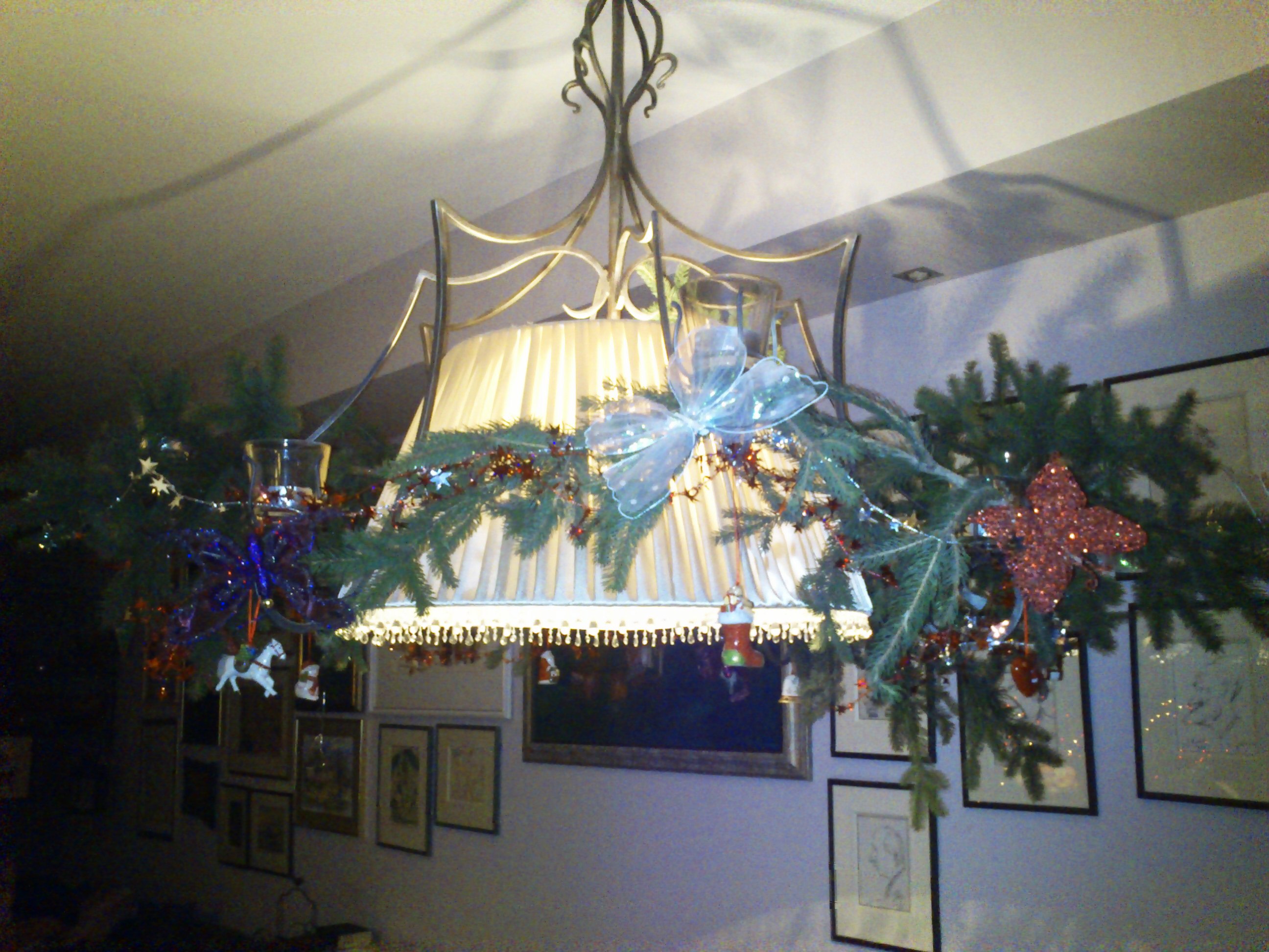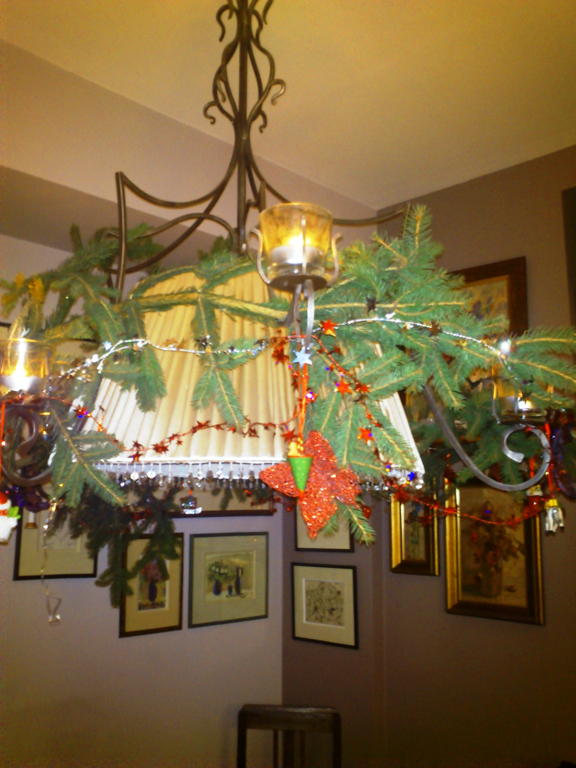 Siedzę przy stole pod lampą przybraną jedliną, wysuszona wydaje ostatnie tchnienie, a siedzące na niej świątecznie przebrane motyle umierają wraz nią, ostatecznie kończąc wątek uroczo kiczowatych bożonarodzeniowych ozdóbek.